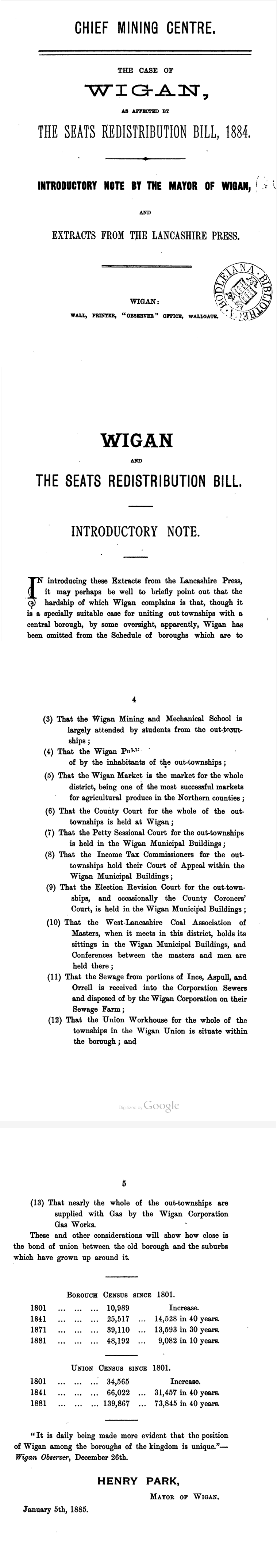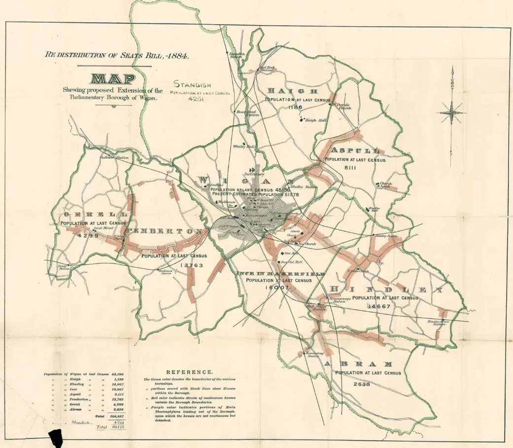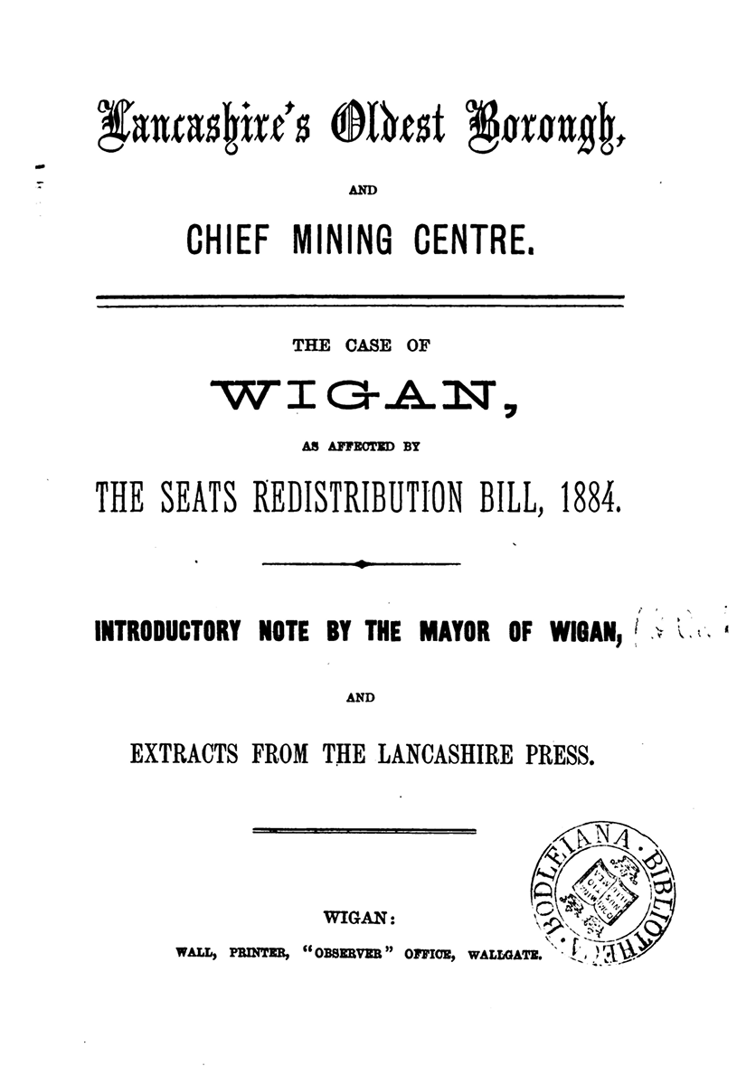 At the time, boroughs with populations between 15,000 and 50,000 were reduced from two MPs to one. Wigan’s campaigners argued that the 1881 census figures were misleading — around 2,000 local people were away seeking work during a mining strike. Had they been counted, the town’s population would have exceeded 50,000 and Wigan would have kept both MPs.